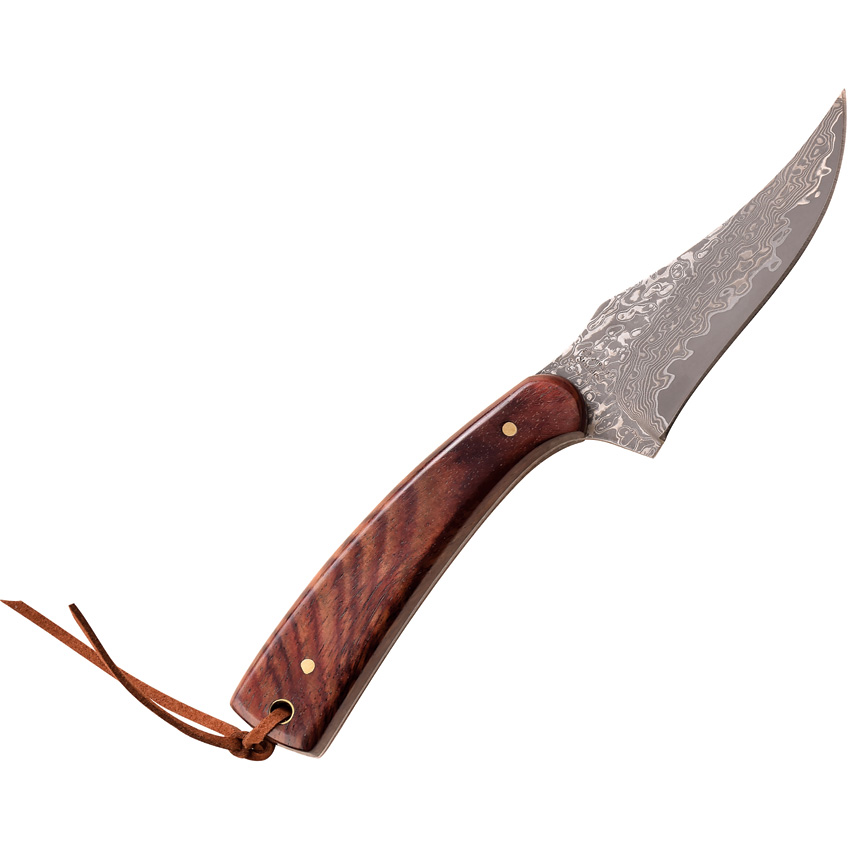 7″ (17.78cm) overall. 3″ (7.62cm) Damascus steel blade. Rosewood handle. Full tang. Lanyard hole. Brown leather belt sheath. Boxed.
