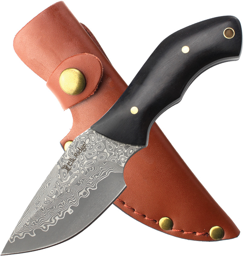 7″ (17.78cm) overall. 3.25″ (8.26cm) Damascus steel blade. Brown wood handle. Full tang. Lanyard hole. Brown leather belt sheath. Boxed.