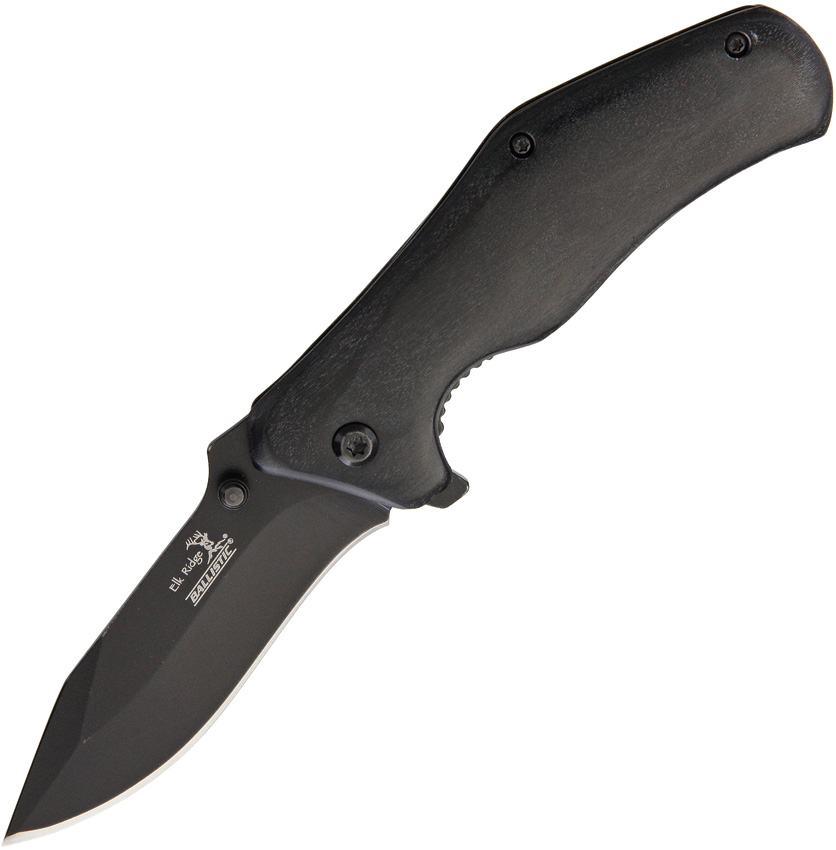 Elk Ridge A013BK – Assisted Opening Linerlock Folding Pocket Black Finish Knife with Black Wood Handles. Linerlock. Assisted opening. 4.13″ closed. 3.13″ black finish stainless blade. Black wood handle. Thumb stud. Extended tang. Pocket clip. Made in China.