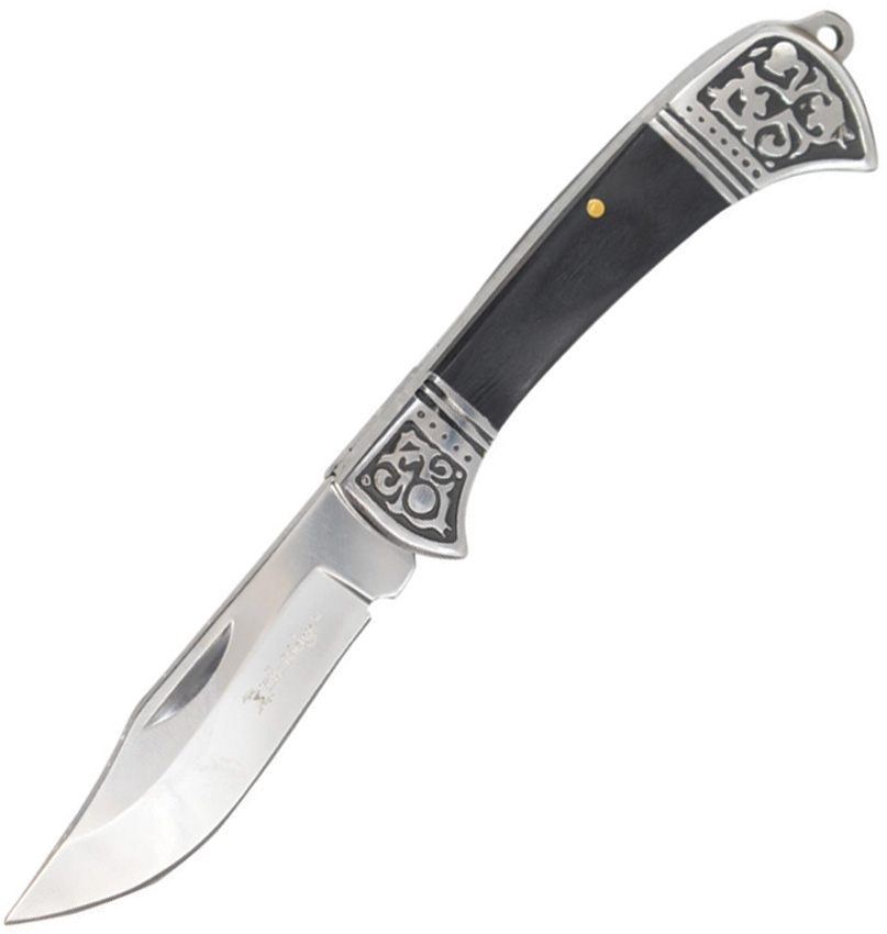 3″ (7.62cm) closed. 2.5″ (6.35cm) satin finish stainless clip blade. Black wood handle. Stainless bolster(s). Lanyard hole. Slip joint. Boxed.