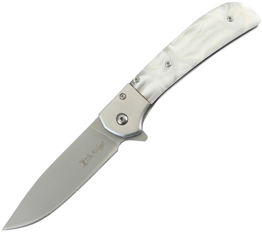Assisted opening. 4.75″ (12.07cm) closed. 3.5″ (8.89cm) satin finish 3Cr13MoV stainless spear point blade. Faux mother of pearl handle. Stainless bolster(s). Extended tang. Pocket clip. Boxed.