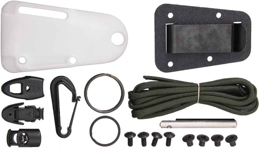 6.25″ overall. 2.63″ purple powder coated 1095HC steel blade. Full tang. Finger ring. Kit includes paracord, split rings, ferro fire starting rod, whistle, snap hook, MOLLE lock, and hardware. One piece skeletonized construction. White molded plastic sheath with clip plate attachment.