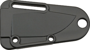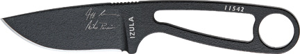 6.25″ overall. 2.63″ black powder coated 1095HC steel drop point blade. Black handle. Finger ring. Full tang. One piece skeletonized construction. Blade features Jeff Randall and Mike Perrin signature etching. Molded plastic sheath with clip plate attachment.