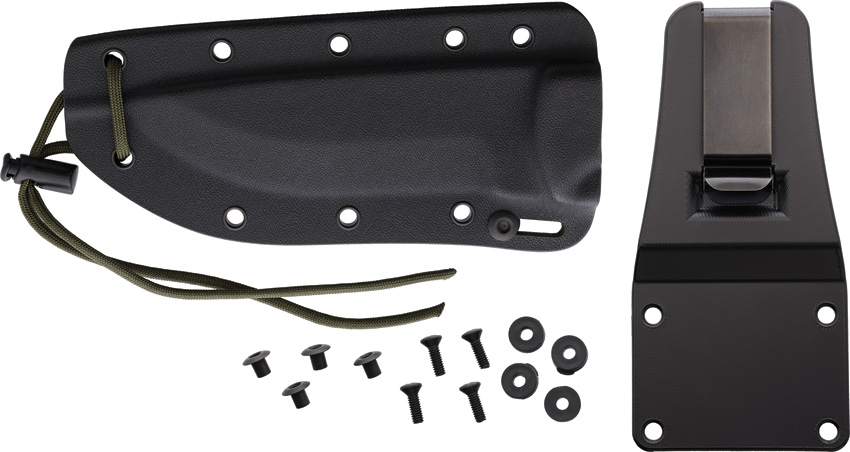 Model 5. 11″ (27.94cm) overall. 5.25″ (13.34cm) black powder coated 1095HC steel blade. Canvas micarta handle. Glass breaker. Full, extended tang. Lanyard hole. Survival – Escape – Evasion Knife. Handles feature a divot that can be used as the socket for the fire bow drill method. Black Kydex sheath with clip plate attachment.