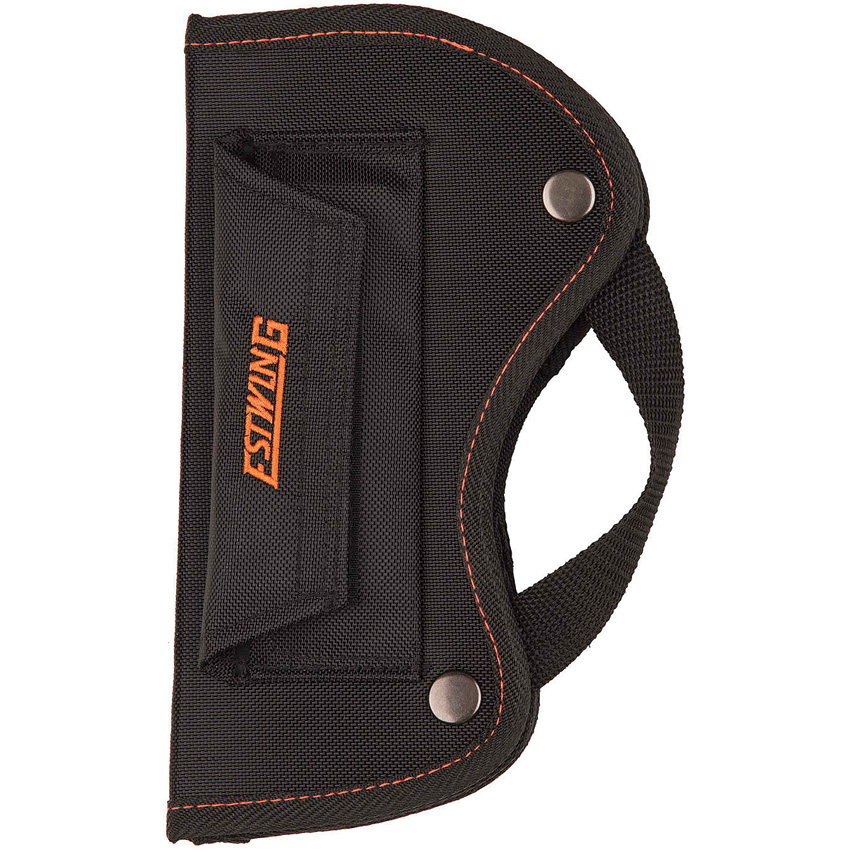 Construction: U.S. Steel; Color: Black; Overall: 13.5″; Blade: Stainless l Standard Edge l Powder Coated Finish; Handle: Orange l Rubber; Other Info: 2.875″ sharpened axe edge. Patented shock reduction grip. Black nylon belt sheath. Includes sharpening stone. Hang Packaged.