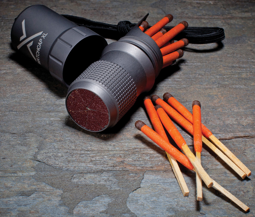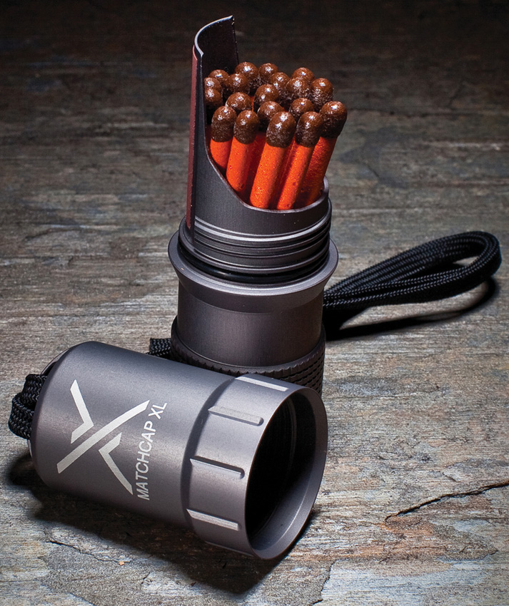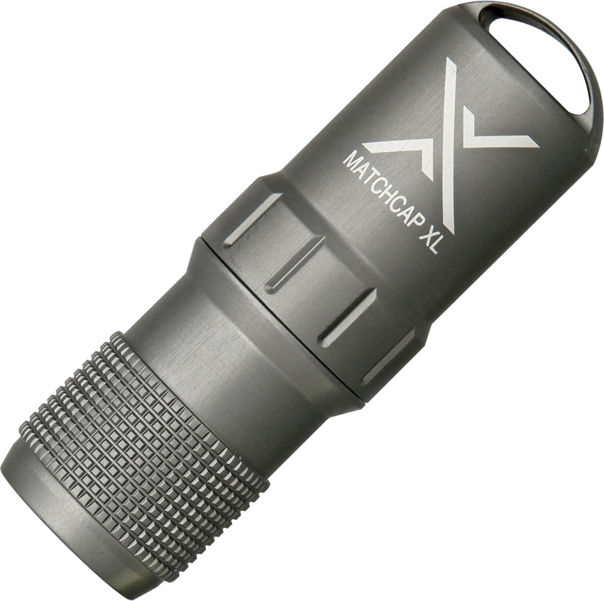 Survival Match Case with Strikers. 3.60″ overall length. 1.20″ diameter. Textured aluminum construction with lanyard loop. Match capacity: 40 kitchen matches, 32 NATO matches or 25 stormproof matches. Fits matches up to 2.9″ in length. Note: For maximum match capacity, place a majority of the matches head up with a few head down. Two built-in strikers work well with both safety and strike anywhere matches. O-ring sealed. Waterproof to more than 5 meters. Same design as the MATCHCAP original except XL version features: larger, improved striking surfaces; and larger diameter and height for increased capacity. The new design leaves up to 0.3″ to spare for tinder storage when using stormproof matches and nearly half of the MATCHCAP XL is available for storage if using kitchen matches. The extra space may also be used to store water purification tablets, medicine, fishing hooks, first aid supplies, etc. Packaged with extra O-rings, extra match strikers, and instruction manual. Empty weight: 1.25 oz. Gunmetal body.