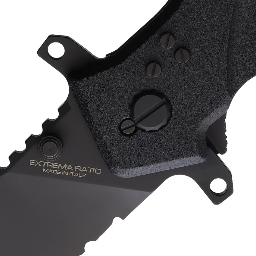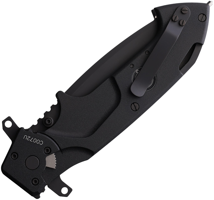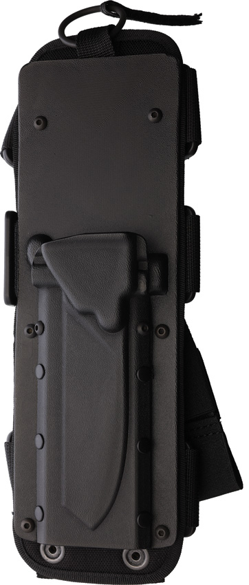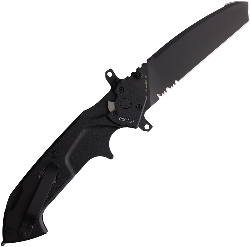 6.13″ (15.57cm) closed. 4.5″ (11.43cm) black MIL-C-13924 burnished partially serrated Bohler N690 stainless tanto blade. Black anodized aluminum handle. Glass breaker. Pocket clip. Thumb stud. Extended tang. Back of the handle features a specialized tool for cutting plastic handcuffs. Safety lock. Black ABS MOLLE compatible belt sheath. Boxed.