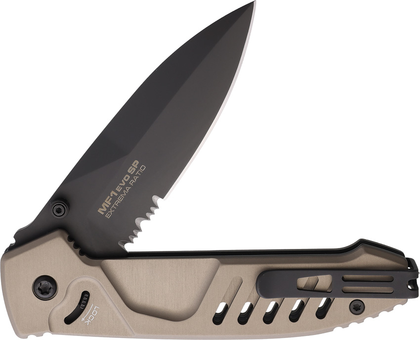 5.25″ (13.34cm) closed. 3.75″ (9.53cm) black MIL-C-13924 burnished partially serrated Bohler N690 stainless spear point blade. Tactical mud anodized aluminum handle. Thumb stud. Pocket clip. Glass breaker. Supported by a new generation safety system HIDDEN LOCK”. Boxed.