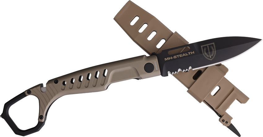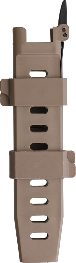 5.5″ (13.97cm) closed. 3.38″ (8.59cm) black MIL-C-13924 burnished partially serrated Bohler N680 stainless spear point blade. Tactical mud anodized aluminum handle. Finger ring. Glass breaker. Belt/cord cutter. Tan synthetic sheath. Boxed.