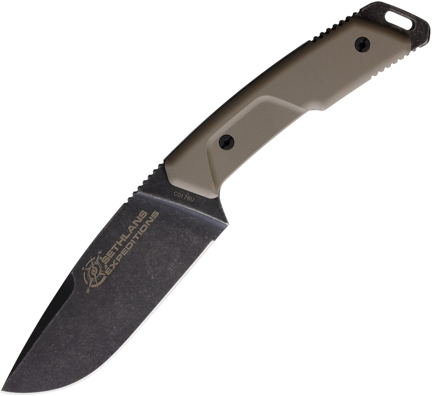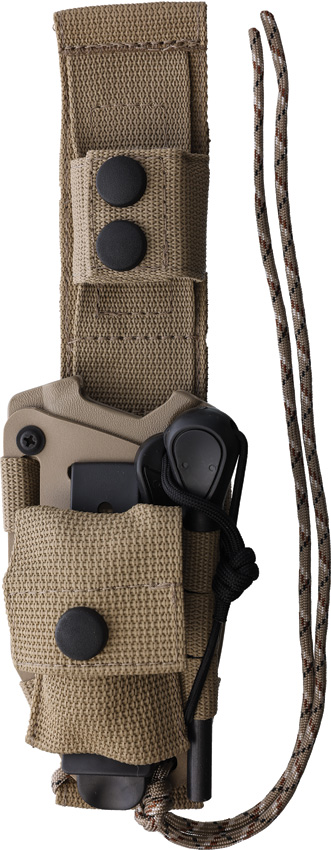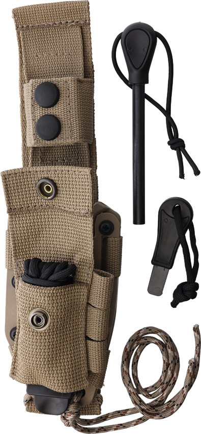 8.88″ (22.56cm) overall. 4.25″ (10.8cm) black stonewash finish Bohler N690 stainless blade. Tan G10 handle. Full, extended tang. Lanyard hole. Tan and black Kydex and nylon belt sheath can be disassembled and adapted for both left and right handed users. It is also equipped with a mini pouch with M. O. L. L. E. System containing a two-sided sharpening stone and a fire steel. Boxed.