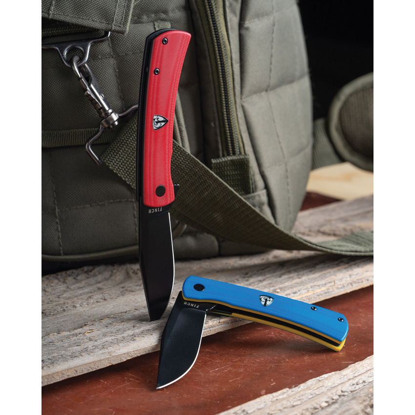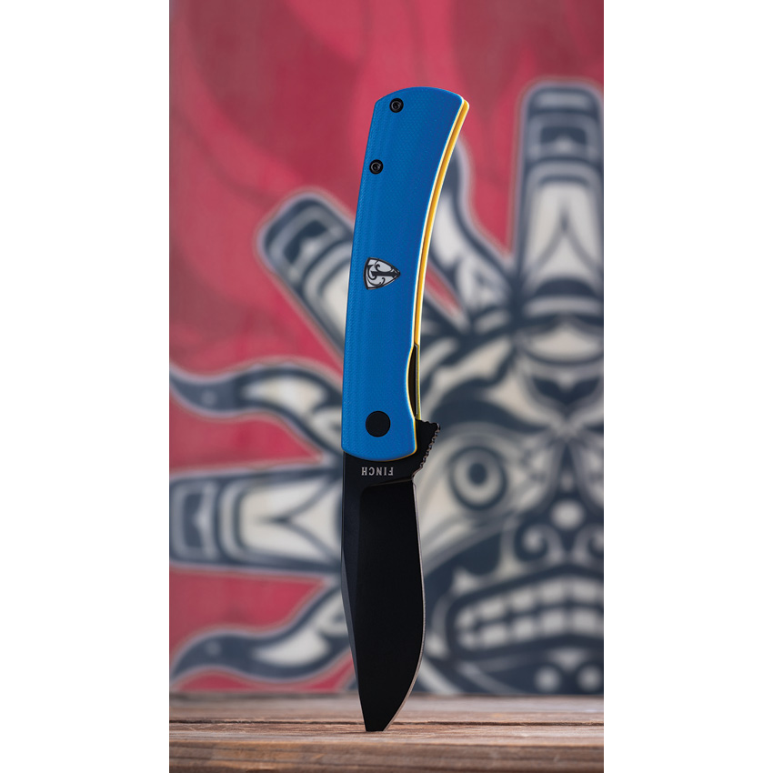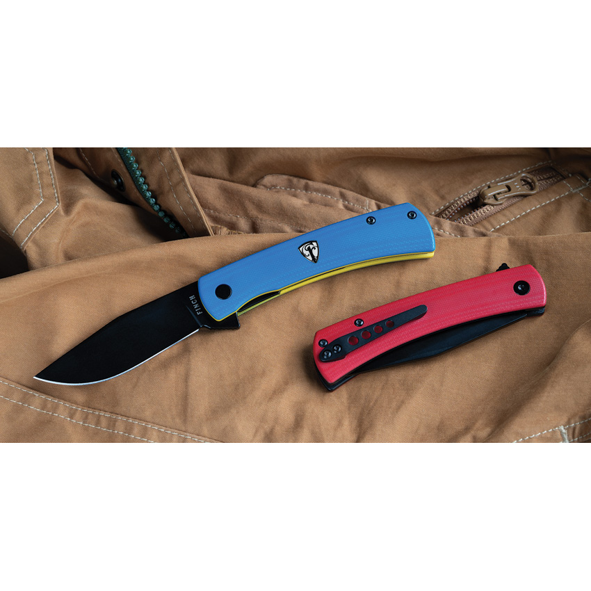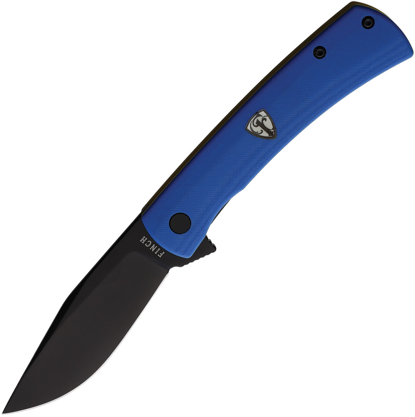 4″ (10.16cm) closed. 3″ (7.62cm) black finish 14C28N stainless blade. Blue G10 handle. Inlay shield. Extended tang. Pocket clip. Boxed. No Amazon Sales