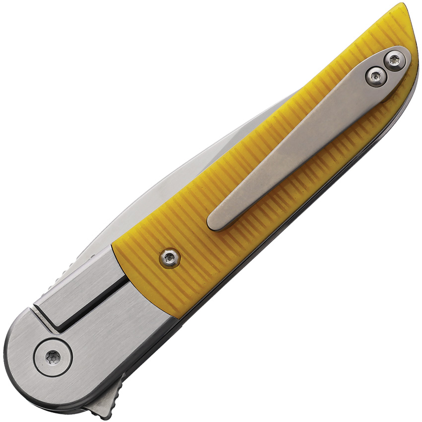 4″ (10.16cm) closed. 3″ (7.62cm) satin finish 154CM stainless blade. Yellow jigged bone handle. Stainless bolster(s). Extended tang. Pocket clip. Boxed. No Amazon Sales