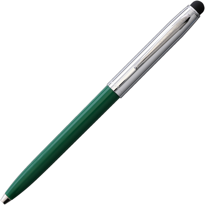 5.25″ overall. Pocket clip. Stylus and PR4 black ink, medium point cartridge. Writes upside down, at any angle, under water, over grease, and in extreme temperatures. Chrome cap. Green barrel. Boxed.