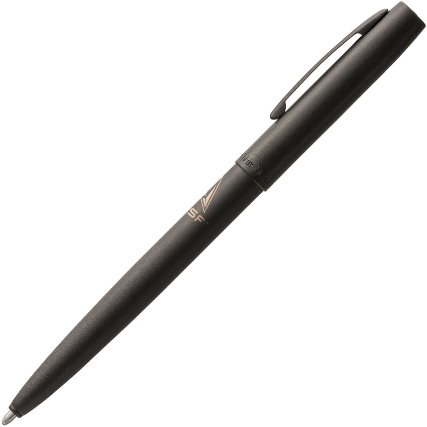 5.25″ overall. Pocket clip. PR4 black ink, medium point cartridge. Writes upside down, at any angle, under water, over grease, and in extreme temperatures. USSF logo on barrel. Color: Matte black. Boxed.