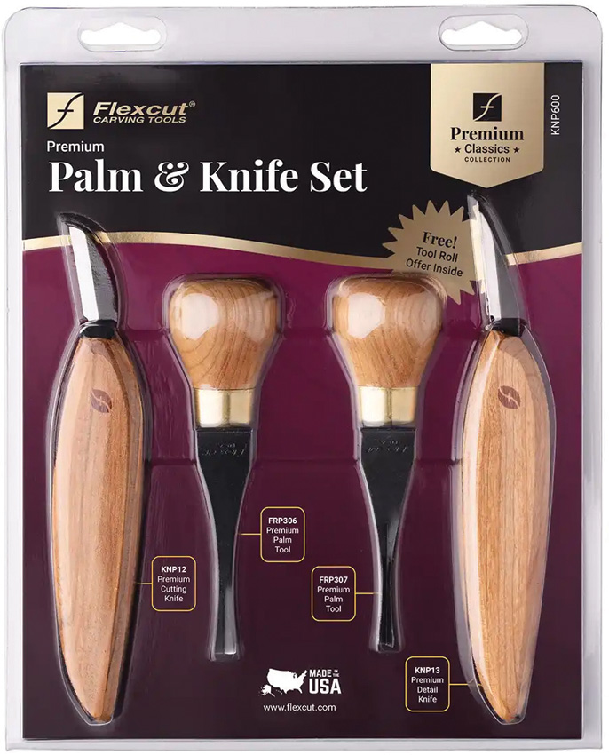 Cherry wood handle. Includes: KNP12 Premium cutting knife; FRP306 Premium palm tool; FRP307 Premium palm tool; KNP13 Premium detail knife; Tool roll. Clam packed.