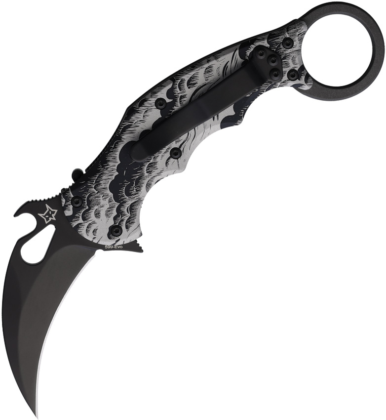 4.75″ (12.07cm) closed. 2.5″ (6.35cm) black coated Bohler N690 stainless karambit blade. Black aluminum handle. Finger ring. Pocket clip. Extended tang. Thumb pull. Wave handle artwork. Boxed.