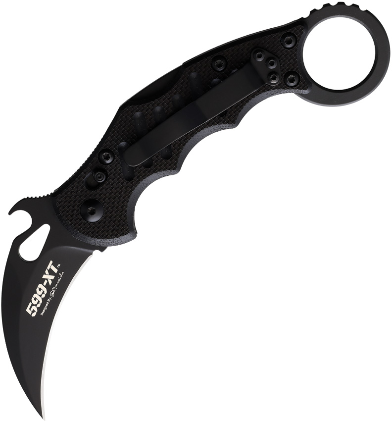4.88″ (12.4cm) closed. 2.5″ (6.35cm) black coated Bohler N690 stainless karambit blade. Black finger grooved G10 handle. Finger ring. Pocket clip. Glass breaker. Extended tang. Boxed.