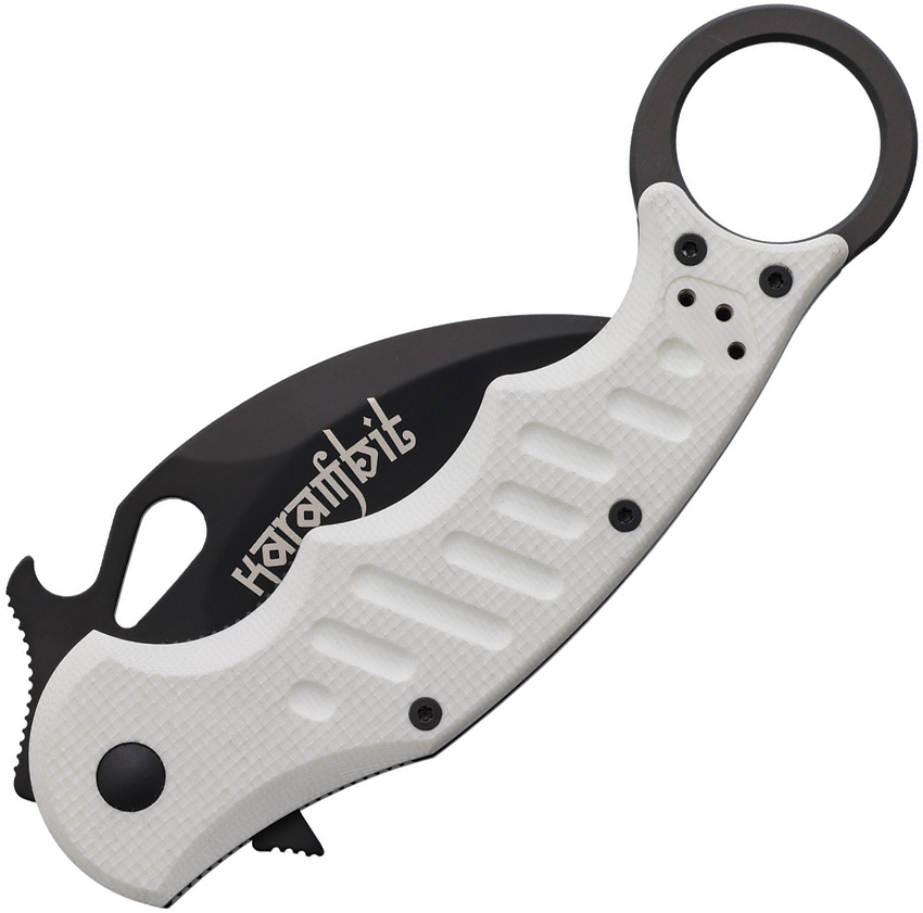 5.25″ (13.34cm) closed. 3″ (7.62cm) black finish Bohler N690 stainless karambit blade. White G10 handle. Thumb pull. Extended tang. Finger ring. Pocket clip. Boxed. Sales Restriction: No Amazon.com Sales.