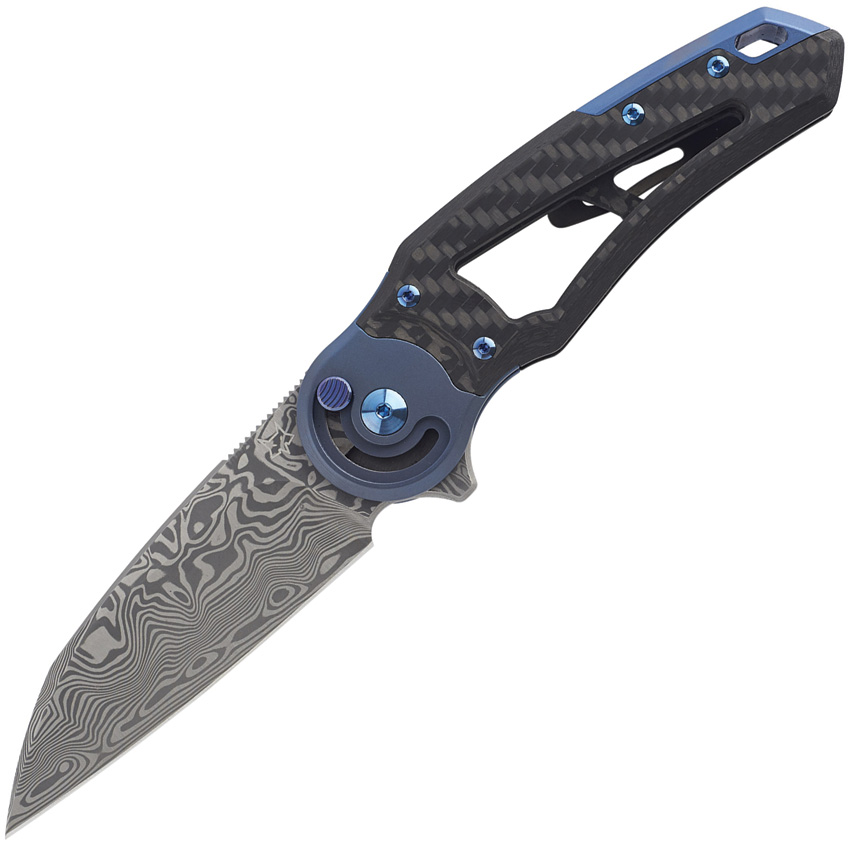 4.75″ (12.07cm) closed. 3.13″ (7.95cm) Damascus steel blade. Carbon fiber handle. Extended tang. Lanyard hole. Pocket clip. Blue anodized accents. Boxed. Sales Restriction: No Amazon.com Sales.