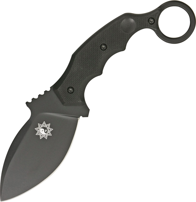 8 3/4″ overall. 3 3/4″ N690Co Cobalt Vanadium stainless blade with black non-stick coating. Black G-10 handles. Full tang. Ring pommel. Black Kydex sheath.