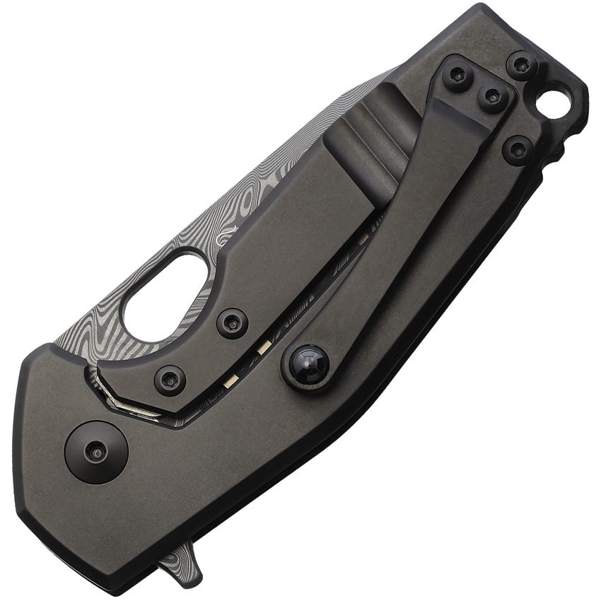 3.5″ (8.89cm) closed. 2.5″ (6.35cm) Damascus steel blade. Carbon fiber handle with black titanium back handle. Extended tang. Lanyard hole. Pocket clip. Thumb pull. Boxed.