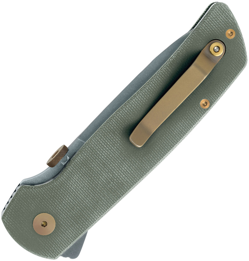 5.13″ (13.03cm) closed. 3.5″ (8.89cm) stonewash finish MagnaCut steel blade. OD green canvas micarta handle. Thumb disk. Pocket clip. Lanyard hole. Black G10 spacer. Black nylon zippered storage case. Designed by Bob Terzuola. Boxed.