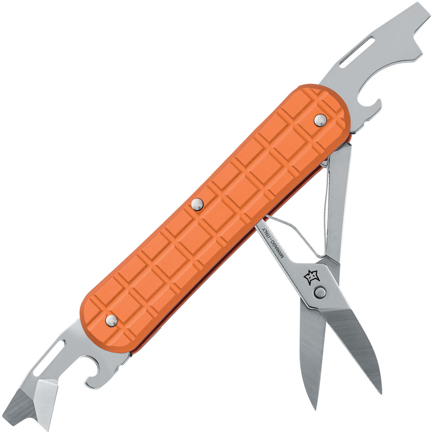 2.88″ (7.32cm) closed. Orange grenade pattern aluminum handle. Tools include: Scissors l Bottle opener l Can opener l Flat head screwdriver l Screwdriver tip l Small blade. Boxed. Sales Restriction: No Amazon.com Sales.