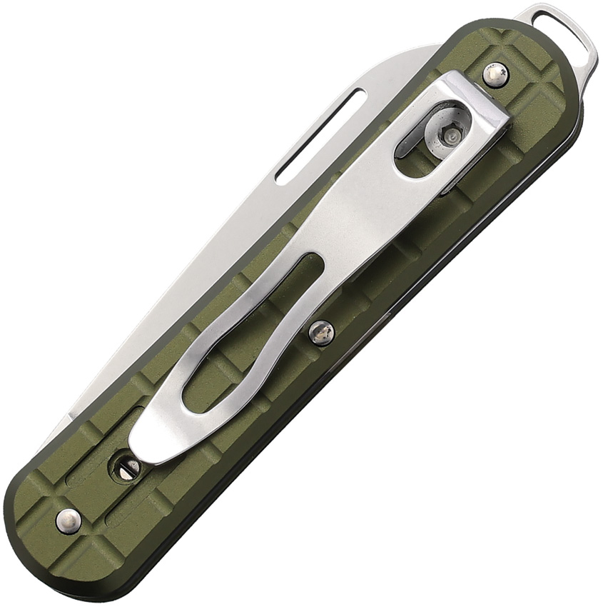 3.13″ (7.95cm) closed. 2.13″ (5.41cm) polished Bohler N690 stainless blade. Military green grenade pattern aluminum handle. Lanyard hole. Thumb pull. Pocket clip. Boxed.