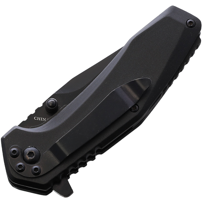 Steel Warrior. Assisted opening. 4″ (10.16cm) closed. 2.75″ (6.99cm) black coated stainless tanto blade. Black aluminum handle. Extended tang. Thumb stud. Pocket clip. Boxed.