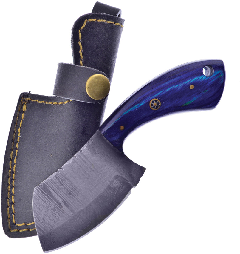6″ (15.24cm) overall. 3″ (7.62cm) Damascus steel cleaver style blade. Blue pakkawood handle. Full tang. Lanyard hole. Black leather belt sheath. Boxed.
