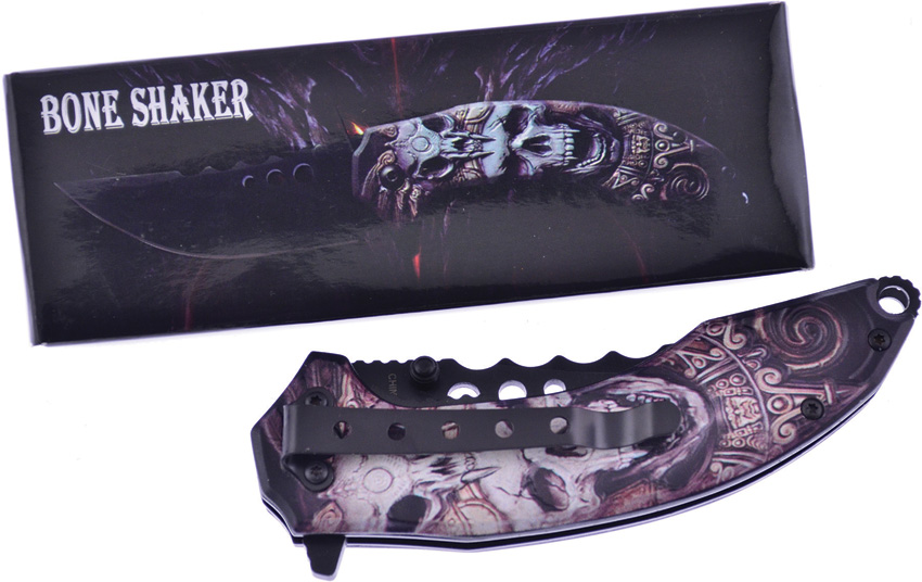 Assisted opening. 4.5″ (11.43cm) closed. 3.25″ (8.26cm) black finish stainless curved blade. Aluminum handle. Thumb stud. Lanyard hole. Pocket clip. Skull handle artwork. Boxed.