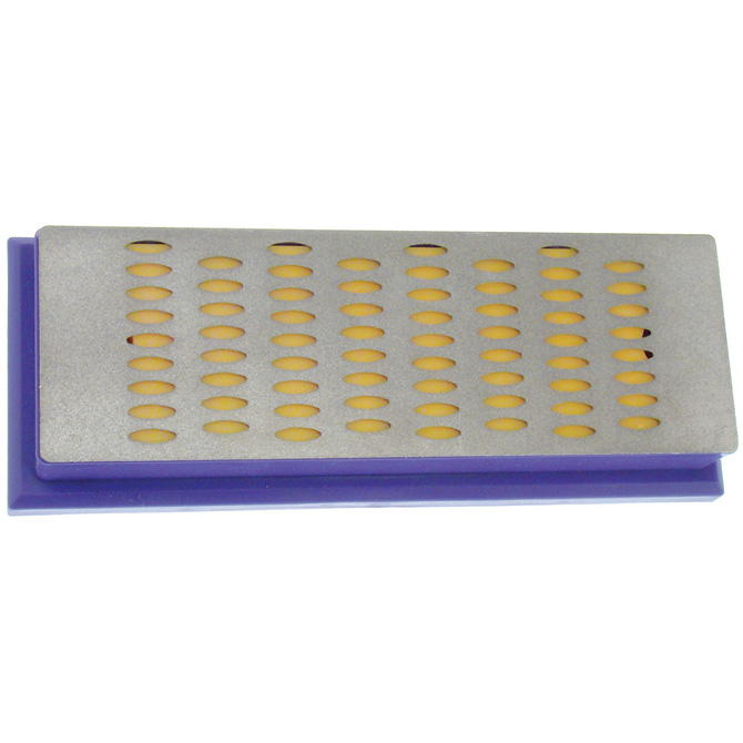 Blademaster. Dimensions: 6″ x 2″. Grit: Medium. Mounted on a plastic block. Yellow housing. A thin layer of perforated steel is molded into a plastic base. The metal is covered with diamonds of precision size, embedded in nickel. Uses only water for lubrication. Hang packaged.