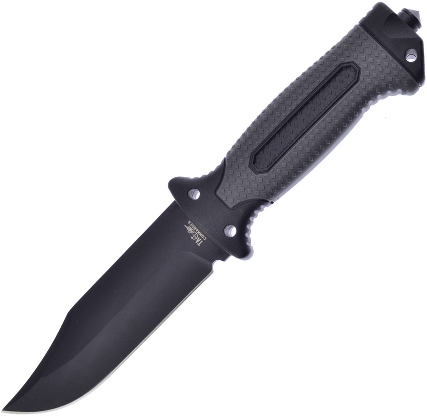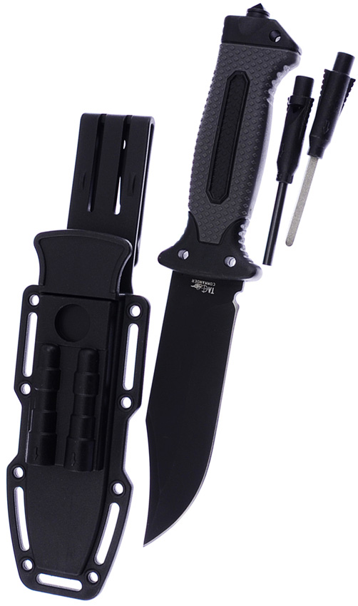 10.75″ (27.31cm) overall. 5.25″ (13.34cm) black finish 420 stainless clip point blade. Black and gray rubberized plastic handle. Glass breaker. Lanyard hole. Firestarter with integrated whistle in sheath. Black molded plastic belt sheath. Boxed.