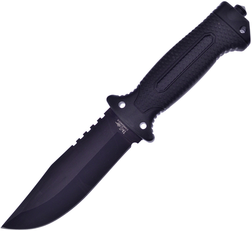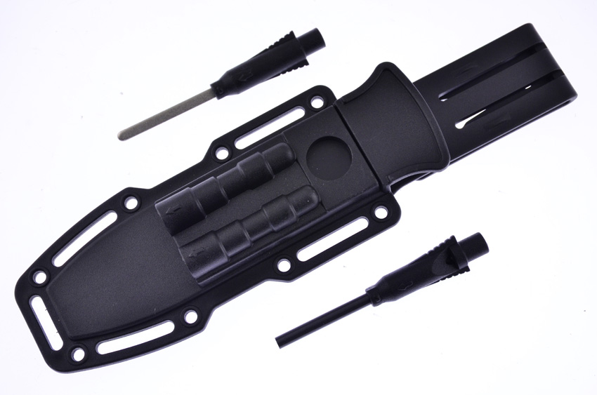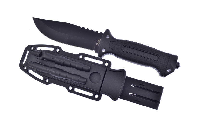 10.75″ (27.31cm) overall. 5.25″ (13.34cm) black finish 420 stainless clip point blade. Black rubberized plastic handle. Glass breaker. Lanyard hole. Firestarter with integrated whistle in sheath. Black molded plastic belt sheath. Boxed.