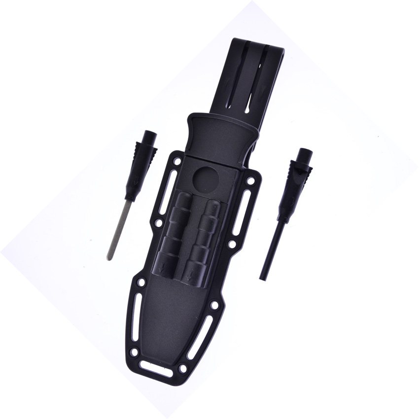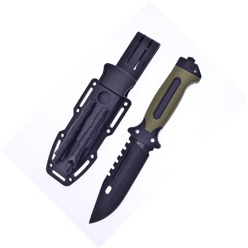 10.75″ (27.31cm) overall. 5.25″ (13.34cm) black finish sawback 420 stainless clip point blade. Black and green rubberized plastic handle. Glass breaker. Lanyard hole. Firestarter with integrated whistle in sheath. Black molded plastic belt sheath. Boxed.