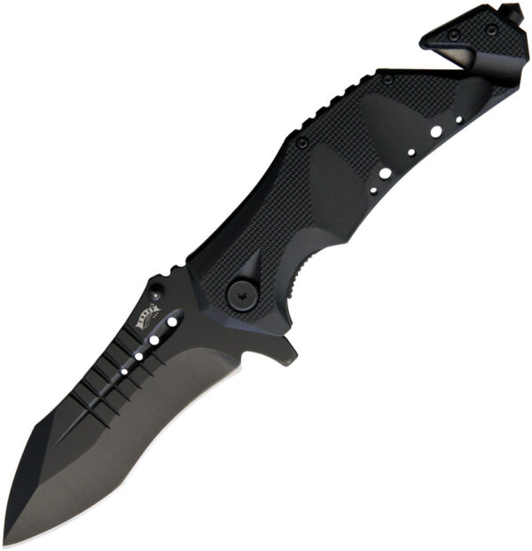 Assisted opening. 5.25″ (13.34cm) closed. 4″ (10.16cm) black finish stainless blade. Black aluminum handle. Extended tang. Thumb stud. Glass breaker. Belt/cord cutter. Pocket clip. Boxed.