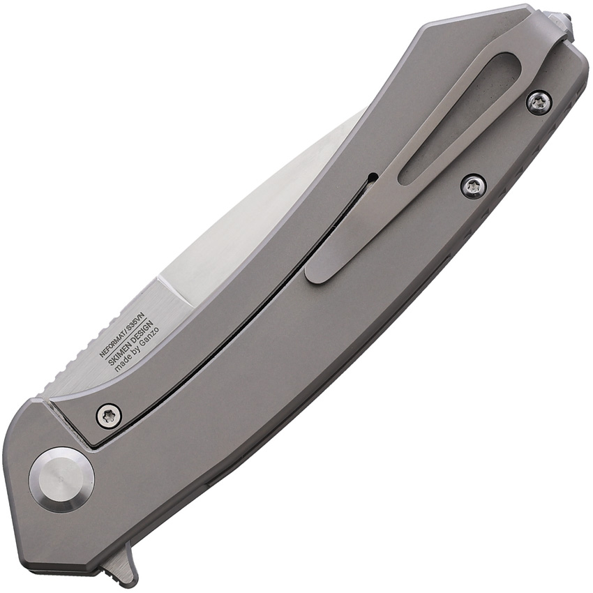 4.63″ (11.76cm) closed. 3.5″ (8.89cm) satin finish S35VN stainless blade. Gray titanium handle. Extended tang. Glass breaker. Pocket clip. Boxed.