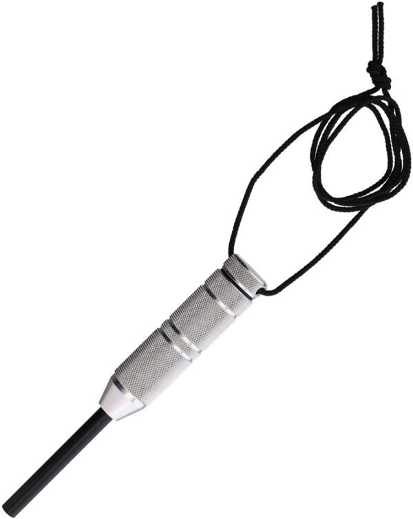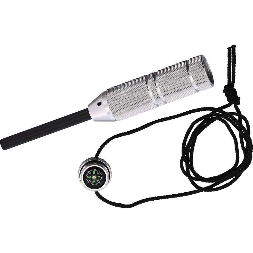 5.88″ overall. Features a virtually watertight aluminum handle capsule for storing tinder and other emergency supplies with a button compass in the cap. Capsule has 0.88″ outside diameter and approximately 2.25″ of usable storage. Paracord lanyard. 0.3125″ diameter ferro rod. Comes in burlap pouch. Satin finish handle.