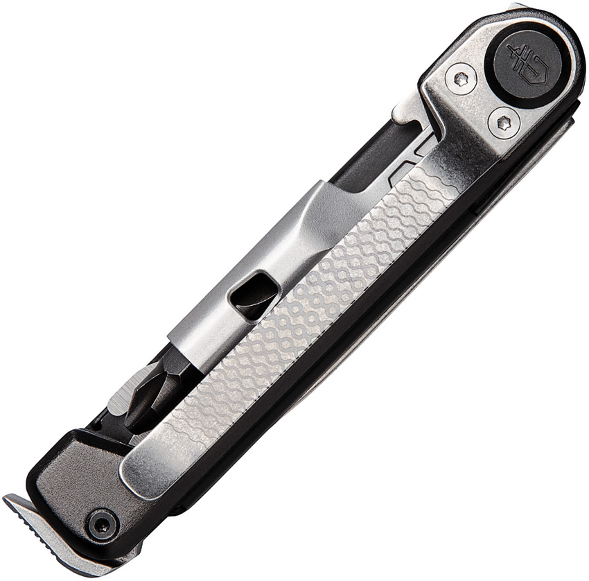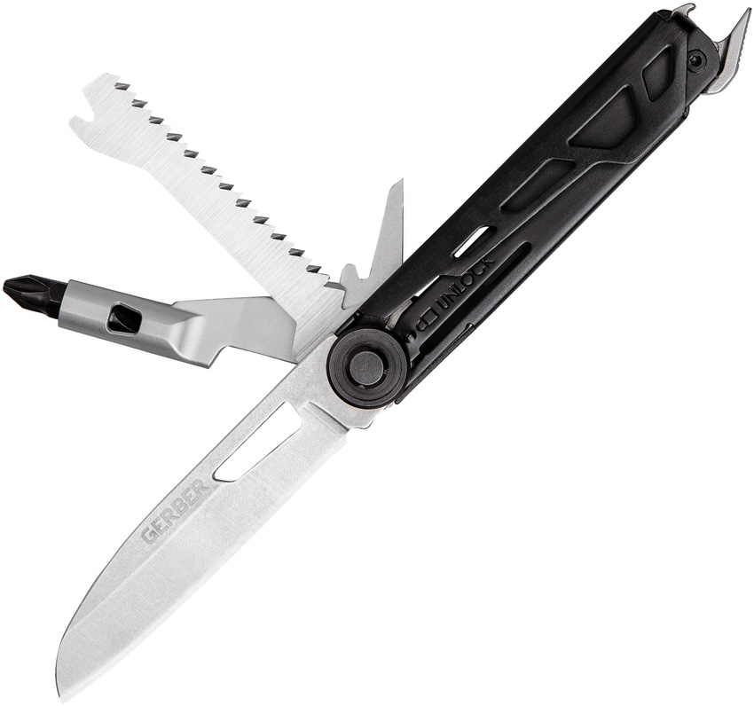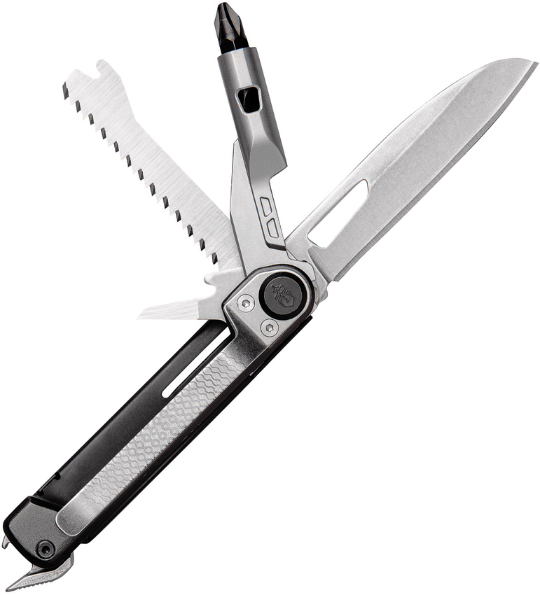 6.5 (16.51cm) overall. 3.63 (9.22cm) closed. Onyx aluminum handle. Tools include: Awl I Bottle opener I Pocket clip I Pry bar I Saw blade I Small blade I Hammer I 2.5 extension bit driver with two-sided bit.