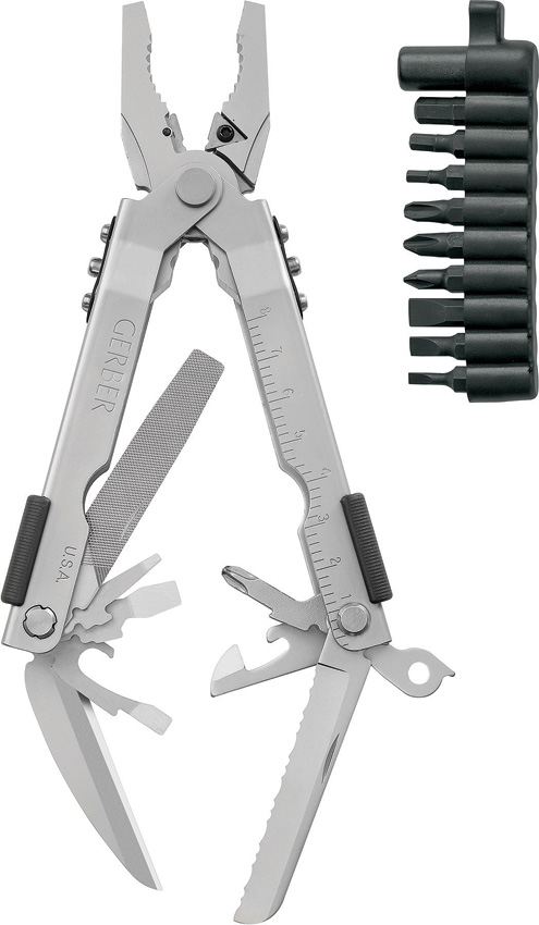 Closed: 4.875″; Overall: 6.375″; Handle: Stainless; Additional Tools: Pliers l Wood Saw l Ruler l Small Screwdriver l Mini Screwdriver l Large Screwdriver l Can Opener l Bottle Opener l Keyring l Nail File l Small Blade; Other Info: One-handed opening. Saf.T.Plus locking knife and tools. Blunt nose pliers. Wire crimper. Tungsten carbide insert cutters. Crosspoint screwdriver. Includes 10 piece universal bit set that is compatible with mutliple multi-tool platforms. Black nylon belt sheath. Boxed.