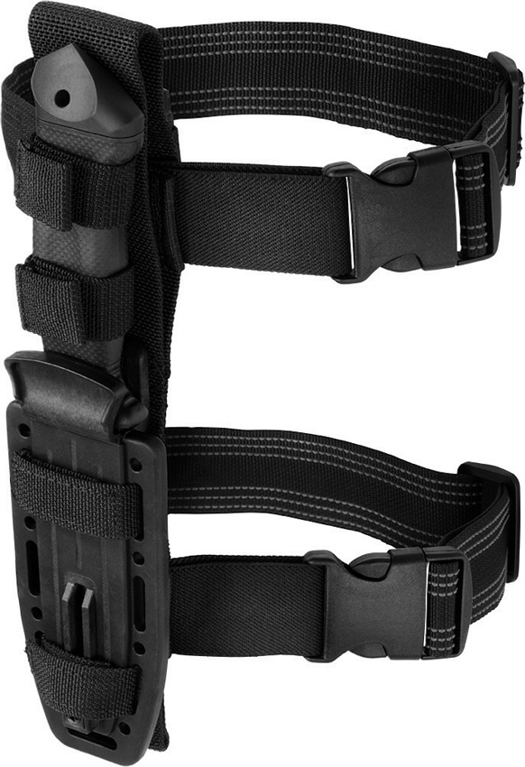 10.63″ (27cm) overall. 4.88″ (12.4cm) black finish partially serrated 420HC stainless drop point blade. Black nylon handle. Full, extended tang. Lanyard hole. Sheath with leg straps and integrated sharpener. Lashing holes for use as spear. Black MOLLE compatible belt sheath. Boxed.