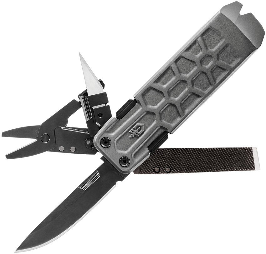 6.63″ (16.84cm) overall. 4″ (10.16cm) closed. Black oxide coated stainless blade. Gray aluminum handle. Tools include: Pry bar l Bottle opener l Scissors l File l Flat head screwdriver l Small screwdriver l Pocket clip. Framelock. Replaceable #11 blade I Chisel I Nail puller. Hang packaged.
