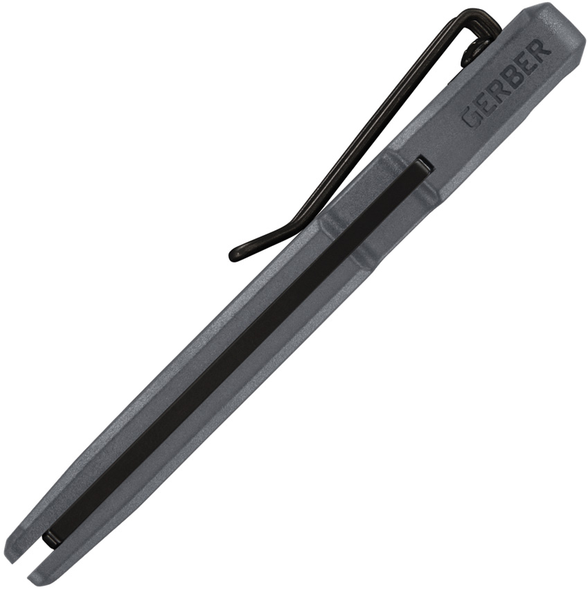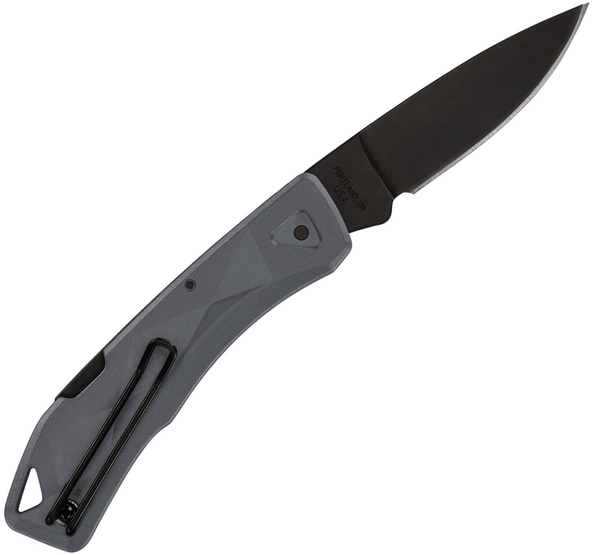3.88″ (9.86cm) closed. 2.88″ (7.32cm) black finish 420HC stainless drop point blade. Gray GFN handle. Lanyard hole. Pocket clip. Boxed with hanging tab.