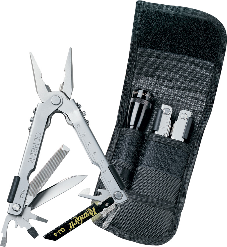 Closed: 5″; Overall: 6.5″; Additional Tools: Bottle Opener l Can Opener l Keyring l Large Screwdriver l Mini Screwdriver l Nail File l Pliers l Ruler l Small Blade l Small Screwdriver l Wood Saw; Other Info: Multi plier 600 and firecracker flashlight. Tungsten carbide insert cutters. Crosspoint screwdriver. One-handed opening. Saf.T.Plus locking knife and tools. Blunt nose pliers. Wire crimper. Firecracker LED flashlight. Uses one AA battery (not included). Black ballistic nylon belt sheath. Boxed.