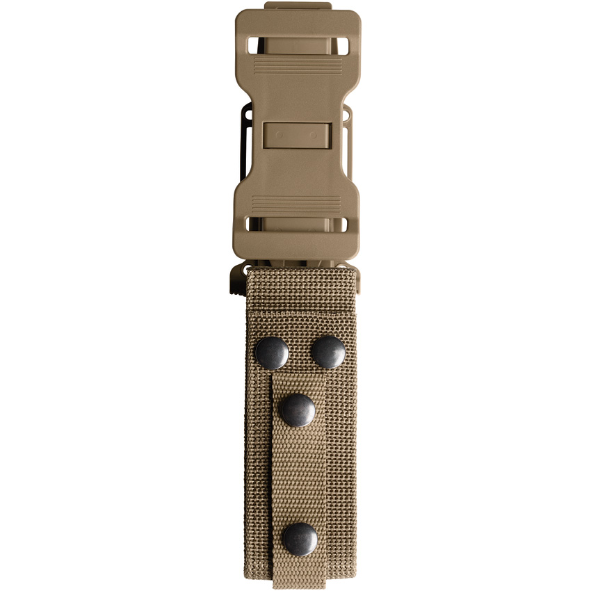 9 3/4″ overall. 4 7/8″ black finish stainless partially serrated blade. Coyote tan glass filled nylon handle with diamond textured rubber overmold. Extended tang with lanyard hole and striking pommel. Coyote tan molded Zytel sheath with horizontal belt loop, snap-on MOLLE strap, nylon retention strap, and nylon belt strap. The unique modular sheath system snap-together components allow the operator to mount the knife vertically on MOLLE, horizontally on a standard 1.75″ tactical belt, or in a traditional drop-leg belt mount fashion.