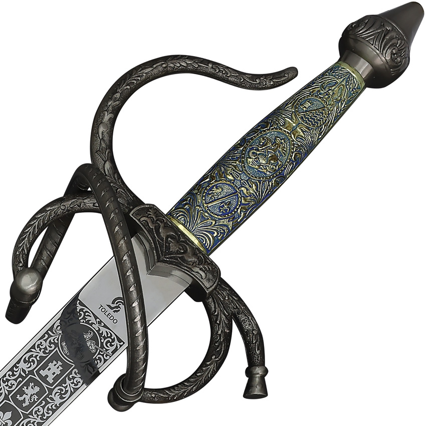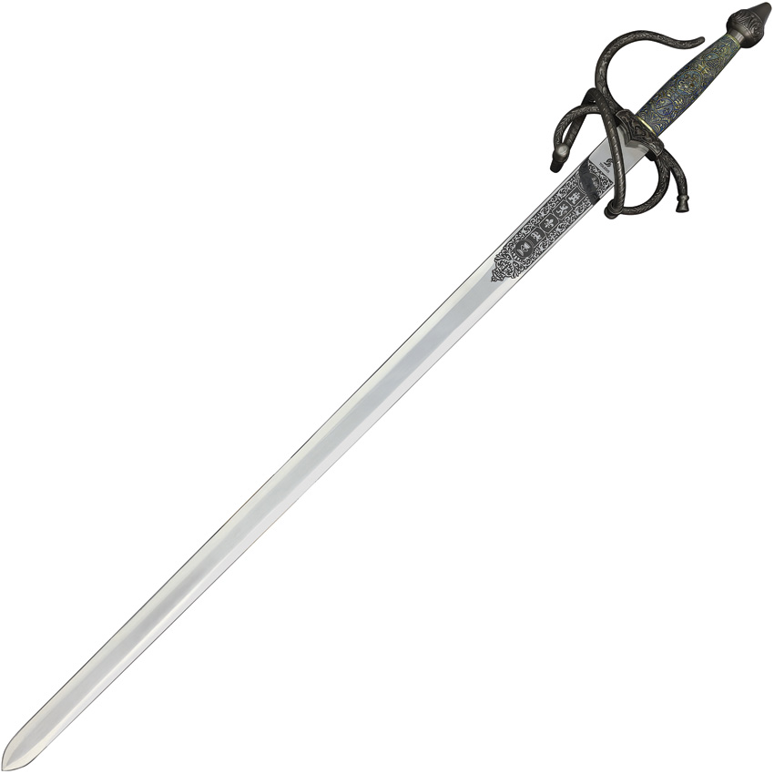 40.25″ (102.24cm) overall. 32″ (81.28cm) satin finish stainless blade. Metal alloy handle. Twisted metal guard. No scabbard. Boxed.
