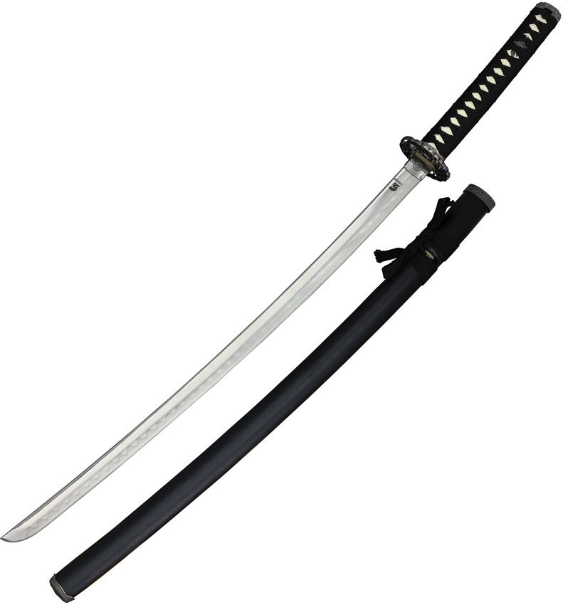 38.5″ (97.79cm) overall. 27.5″ (69.85cm) stainless blade. Black cord wrapped handle. Imitation rayskin handle. Metal tsuba with crane artwork. Black wood scabbard. Boxed.