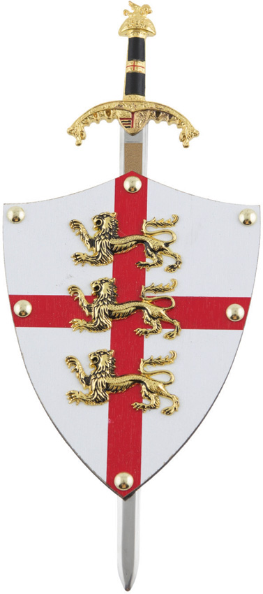 10.5″ (26.67cm) overall. 8″ (20.32cm) unsharpened stainless blade. Gold finish metal alloy and black synthetic handle. Wood wall plaque with hanging chain measuring 5.75″ x 4.5″ x 0.25″. Boxed.