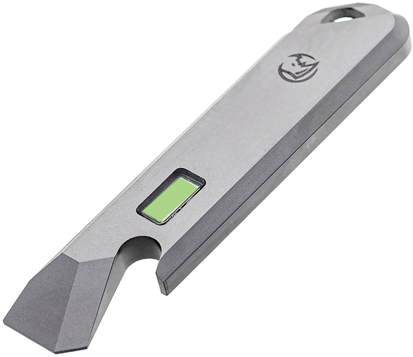 3″ overall. Tools include: Pry bar l Flat head screwdriver l Bottle opener l Lanyard loop. Scoring tool. Green XL Tritium insert. TSA friendly. Titanium construction. Hang packaged.