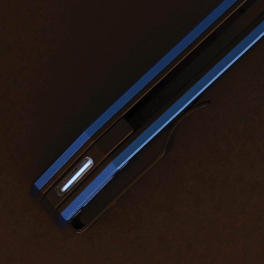 5″ (12.7cm) closed. 3.5″ (8.89cm) black PVD coated MagnaCut steel tanto blade. Blue anodized aluminum handle. Extended tang. Lanyard hole. Pocket clip. Blue BAX Tritium insert. Boxed.